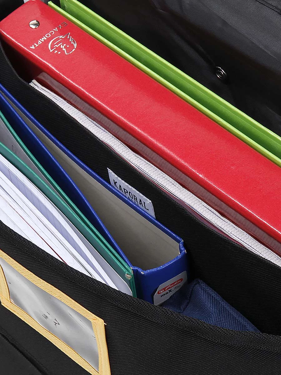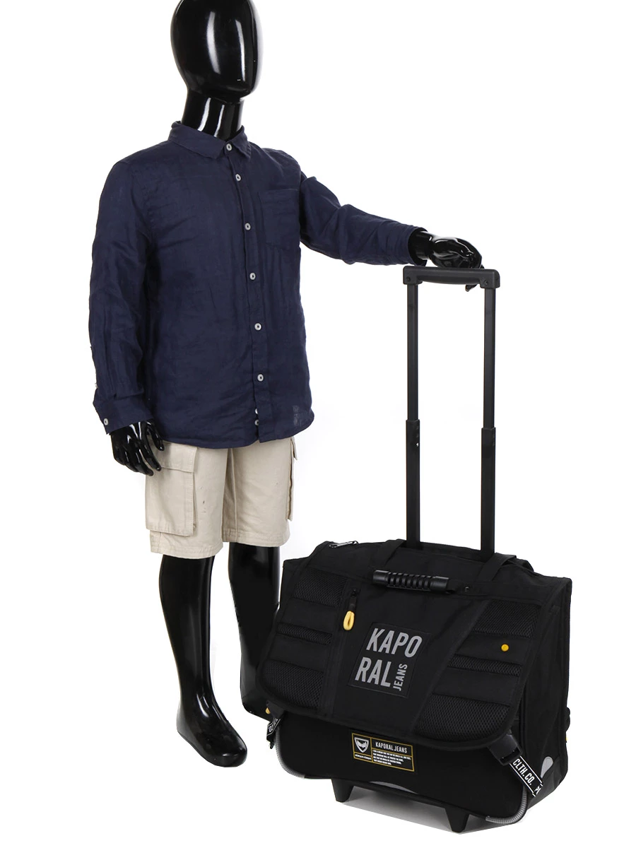 Le cartable trolley Kaporal Basic est muni de deux compartiments pour faciliter l’organisation des divers livres et les retrouver en un clin d’œil pendant la classe. Pour faciliter la préparation des affaires pour le lendemain, un porte emploi du temps est présent sur la face interne du rabat. En-dessous, un passant pour règle permet d’éviter qu’elle n’aille se cacher dans un classeur. Une poche à fermeture à glissière inversée située sous le rabat permet de garder des petits accessoires à l’abri de l’humidité. Au-dessus, un porte-étiquette permet de le restituer facilement à son propriétaire en cas de perte. Pour garder la carte de cantine en accès rapide, il possède également une poche frontale.
