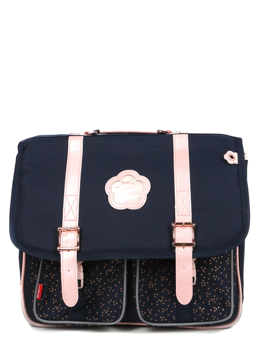 Le cartable Kickers Girl se ferme par un rabat à attaches clips, très commodes d’utilisation, masquées par des sangles à boucle métallique décoratives. Ses deux compartiments permettent de sérier les cahiers et classeurs de formats A4 et 24 x 32 cm, les livres de cours, la trousse et l’agenda. Deux poches frontales ouvertes logent à part les petits accessoires et les indispensables comme la barre de céréales pour la récréation et le paquet de mouchoirs. Les détails très utiles : sous le rabat sont aménagés un porte-emploi du temps et une poche spéciale règle.