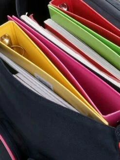 Le cartable CE2 – CM2 Tann’s Leila dispose de deux compartiments pour pouvoir séparer les classeurs et cahiers par taille ou par matière. Sa poche intérieure garde la carte de cantine et les accessoires pour cheveux à l’abri, tandis qu’un passant pour la règle la maintient à sa place à l’aide de bandes velcro. Les deux poches frontales zippées sont parfaites pour garder goûter et carte de cantine à portée de main. Plus question d’oublier la tenue de sport : un porte-planning permet de se rappeler le jour du cours d’EPS !