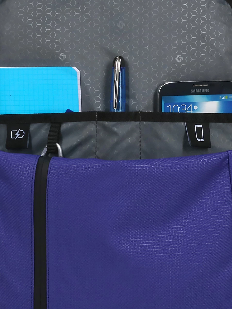 Le sac à dos ergonomique Samsonite Roader M comporte trois compartiments doublés. Le premier, situé à l’arrière et rembourré, est dédié au numérique. Il peut accueillir un ordinateur jusqu’à 15.6 pouces et dispose d’une poche pour tablette. Le second, au milieu, est le plus grand, il peut contenir nombre de dossiers au format A4 maintenus à la verticale dans sa grande poche plate. Une veste peut également trouver sa place à l’intérieur. le troisième compartiment est pensé pour les accessoires. Il est doté d’un mousqueton pour les clefs, d’un passant pour stylo et de deux poches plates conçues pour la batterie nomade (non incluse) et le téléphone avec sa coque. Il peut en outre loger des livres.